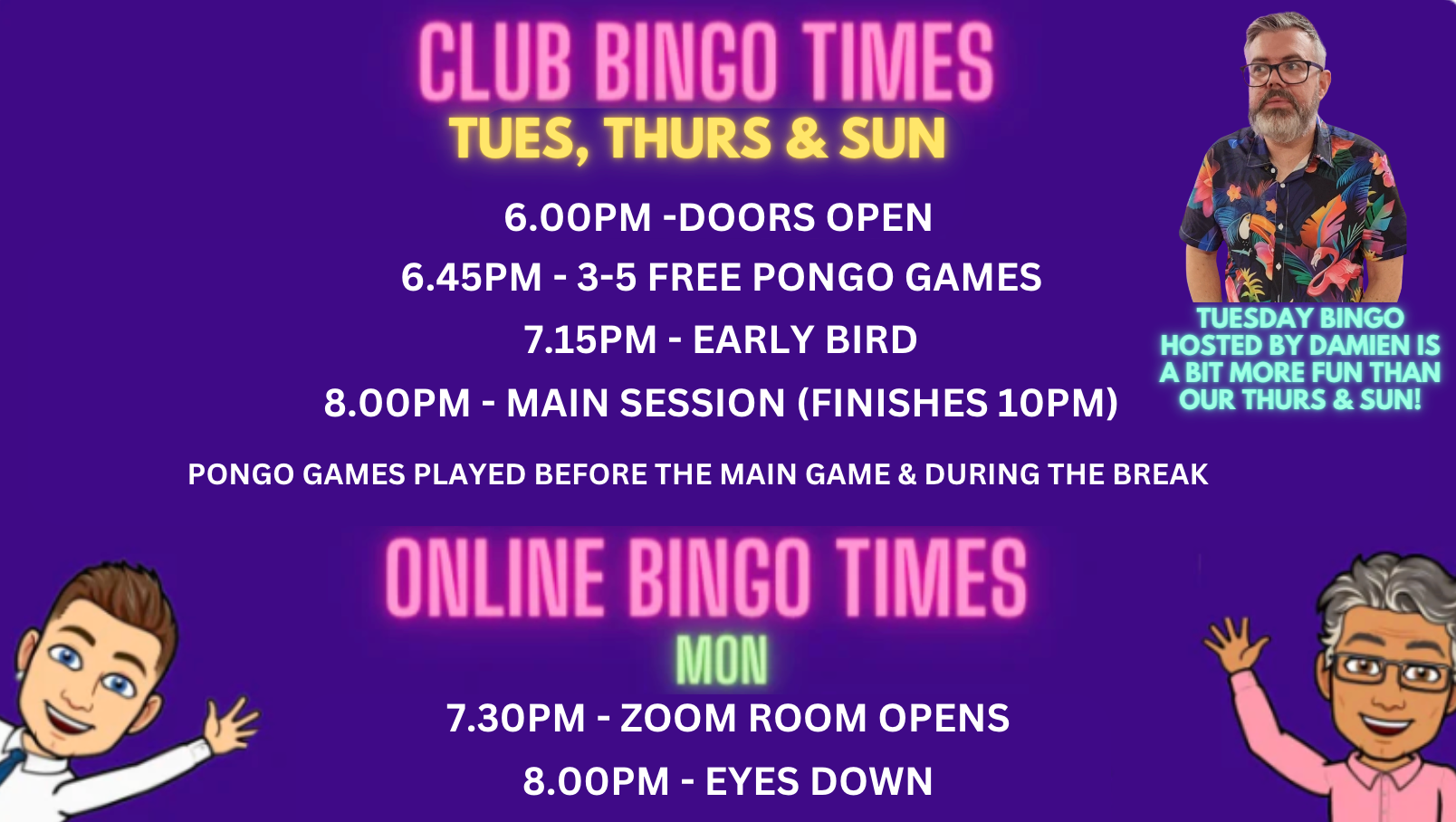 Play online bingo Mondays or club bingo Tues, Thurs & Sun!